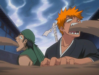 So, everyone gets split up. Uryu ends up with Orihime (but not like that!). Chad ends up all by his lonesome, which is so on-brand for him. Cat-form Yoruichi lands somewhere else, and then there’s Ichigo and Ganju, hugging it out till the very end, when they arrive where Ikkaku Madarame and Yumichika I-Can’t-Spell-His-Last-Name show up. Yumichika takes on Ganju, while Ichigo goes at it with Ikkaku.