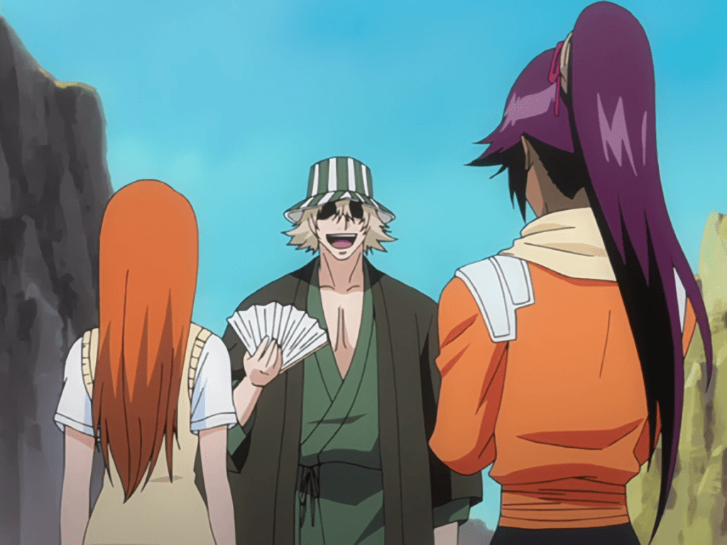 Orihime, who is suddenly getting all the screen time, goes to Urahara’s training ground with Yoruichi. There, she finds out that Kisuke thinks she’s like Survivor: Gabon’s Kenny, virtually useless in this challenge. He doesn’t want her to fight. Anyone with a brain would see that to be the case, as Orihime can’t defeat the weakest of enemies. Yet Chad, another virtually useless fighter, complains to Kisuke that Orihime be allowed to fight, because she was on the rescue crew in the Soul Society. Yeah, Chad, do you even remember what happened there? The only person who made any progress in the entire arc was Ichigo. You and all your pals lost your battles and had to be healed in order to survive. You were useless, and so was Orihime.