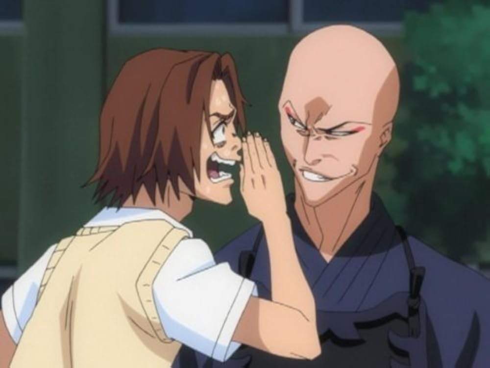 Midway through the big kendo battle, after Ikkaku has coached up his boys, the Soul Reapers get called to a Hollow sighting, and they are all forced to leave their defective Soul Candy bodies behind. (Yachiru of all people is behind the Soul Candy, as proven by the post-credits sequence.) But the kid that Ikkaku trained actually wins his match, leaving no need for Ikkaku to battle. He then takes on everyone in sight when he returns from beating the Hollow. It’s a very Three Stooges ending.