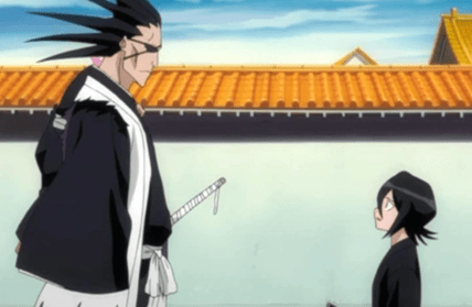 Rurichiyo escaped into the Soul Society, right into danger (it’s danger danger!). She goes to a tea party, at which point she gets attacked. Meanwhile, the bumbling idiots Kenryu and Enryu fall into a predictable trap and get knocked out of contention, but Ichigo shows up in time to SAVE Rurichiyo. After Ichigo SAVES her, she needs SAVING again, and this time Kenpachi SAVES her. But Kenpachi has no interest in the situation and simply leaves.