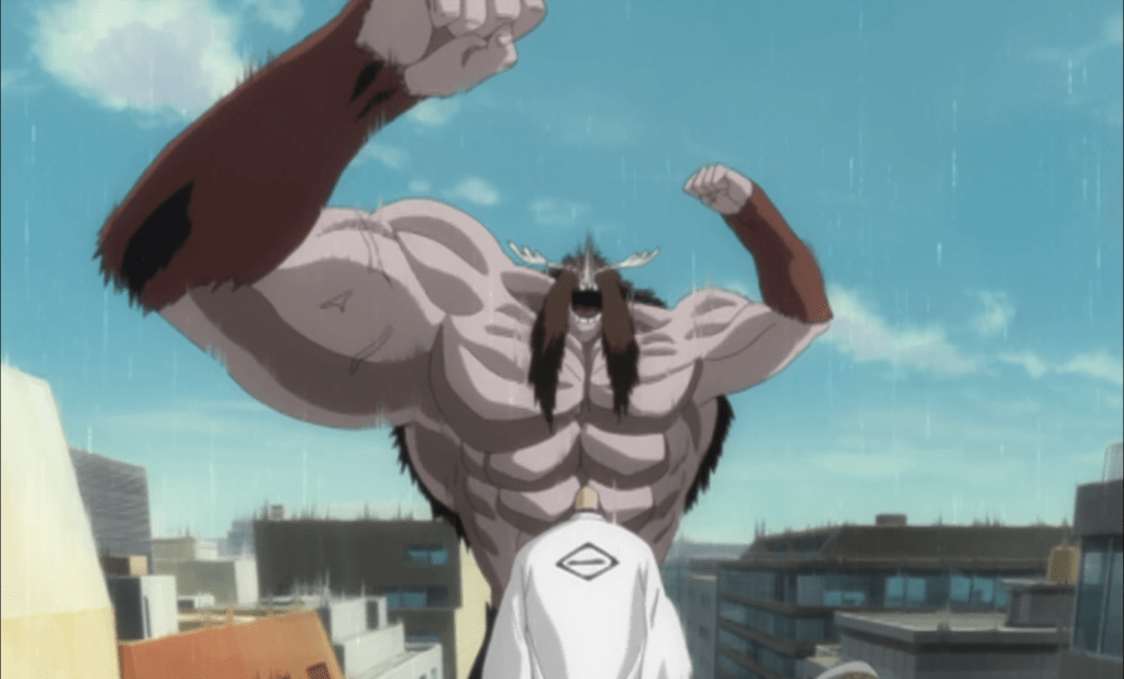 Mila, Sun-Sun, and Apacci’s creation turns into King Kong and starts beating its chest. Old Man Yama looks on and joins the fight. The other Soul Reapers pretty much go down in order, at least the Lieutenants. Some of the Captains are fighting – Soi Fon vs. Barrigan, Shunsui vs. Starrk, and Toshiro vs. Harribel.