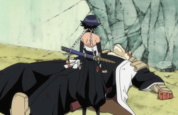Soi Fon beats the crap out of Komamura. Too bad it’s the fake Soi Fon. I can still cheer for her, can’t I, even though it’s not really her? Pretty please?