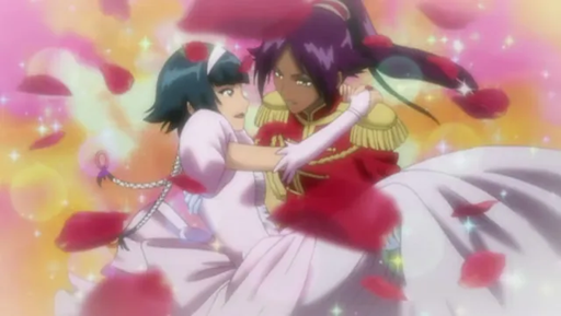 Truthfully, the only good thing about this episode was its “Illustrated Guide to Soul Reapers,” which included the scene shown above, as Yoruichi plays the part of Utena saving her Rose Bride, not Anthy but Soi Fon.