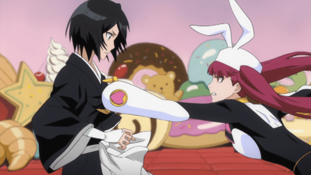 Byakuya fights Tsukishima, which ends in the most ho-hum, been-there-seen-that way. There’s a whole long discourse on how Byakuya’s Zanpakuto works and that, because he knows how it works, Tsukishima can render it useless. But then Byakuya does the tried-and-true method of attacking himself, and that does the trick. Really, how many times can this possibly be used, and not by Bleach but in general? It’s always the way of solving something when there is no other solution. Just attack yourself, and eventually it’ll pay off.